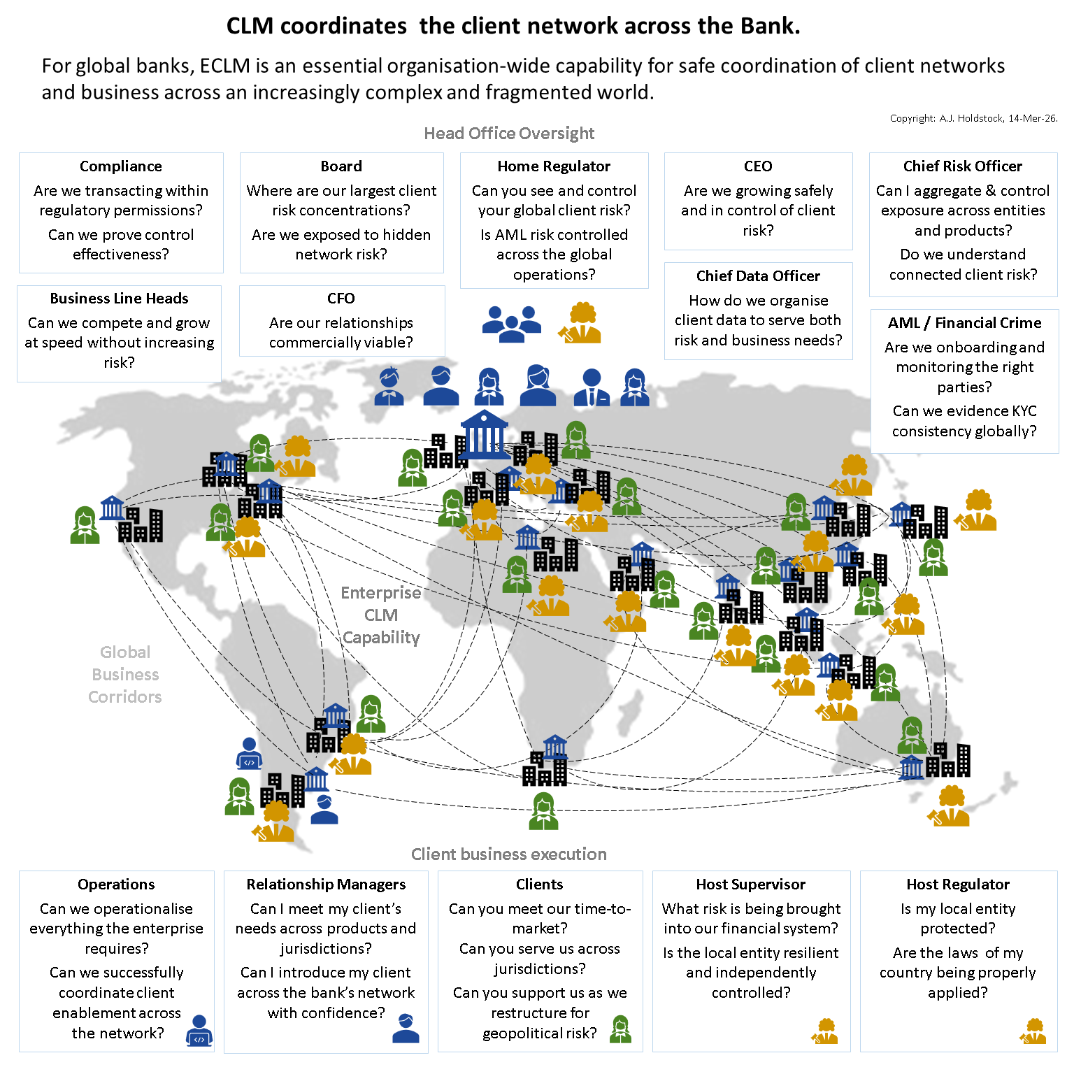 CLM coordinates client networks within global financial institutions by connecting relationship management, operations, risk, compliance and regulators through a shared view of client identity, structure and lifecycle.